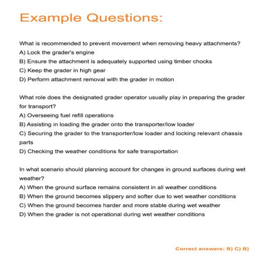 - Comprehensive Preparation: Covering a wide range of topics related to Grader operations, safety measures, attachments, and more, this mock test ensures you’re thoroughly prepared.