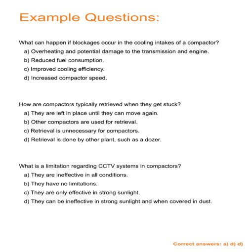 This mock test is specifically designed for operators like you who work with soil and landfill compactors. It’s not a generic practice test – it’s tailored to the challenges and requirements you face in your day-to-day operations.